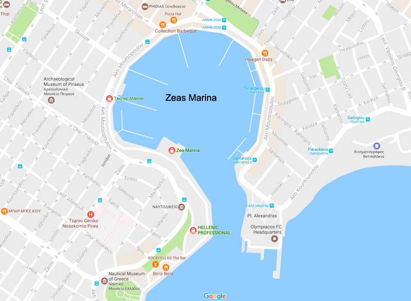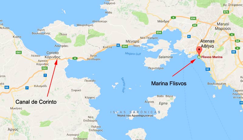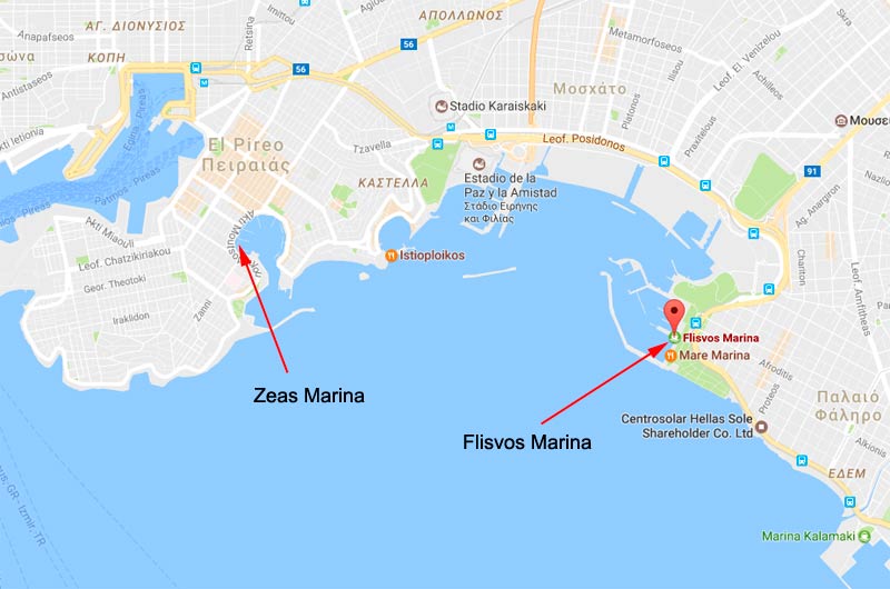 Tomamos tres taxis y recorrimos casi todas las marinas, conocimos una que se llama Athens pequeña, muy linda pero muy cara, la más cara de todas. A todos los amigos les recomiendo la marina Zeas, una marina redondita, que mirando la carta está sobre babor, sobre la izquierda, en Vidaeus, un poco alejada de Atenas en lugar muy bonito, mucho más económico, Atenas es carísimo, un café te cuesta 4 euros y además no me gustó, estoy desilusionada con Atenas.