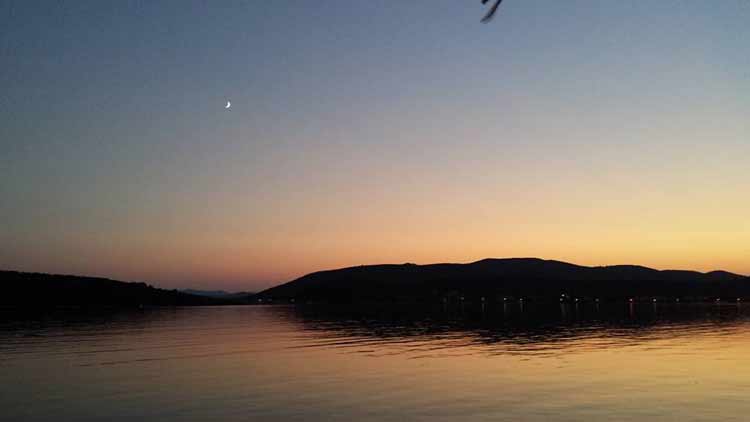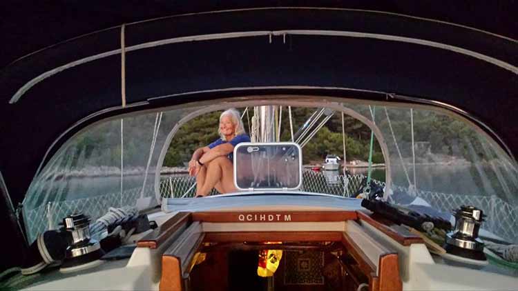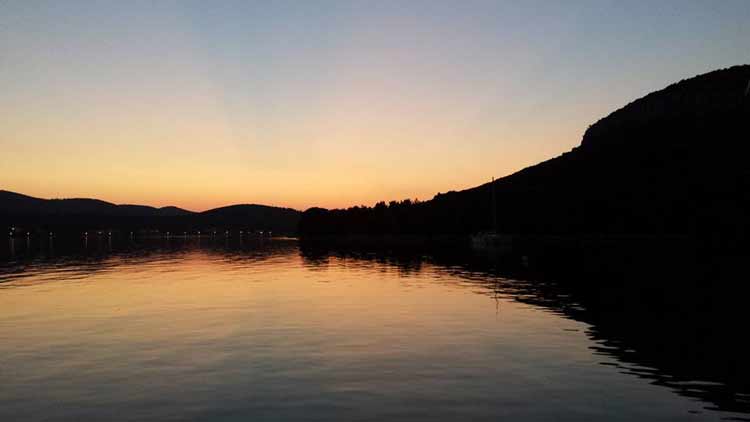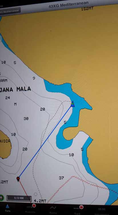 Llegamos y empecé a transpirar copiosamente.. porque además de la altura… tiene dos bancos a los costados de 0 de profundidad más 4 nudos de corriente.. o sea para poner nervioso a cualquiera …encaro y con el hay. .hay.. hay… en la boca.. pasamos justito…. el pasaje es reestrecho….. lo van a ver en la foto…. apenas pasamos el puente el paisaje cambio rotundamente…. del verde pasamos a una costa de concreto …lleno de grandes edificios.. .lanchas.. .cruceros y maxi… andando a toda velocidad… haciendo grandes olas… el mar como encrespado… viento del N bastante fuerte…. en fin…. Marisa y yo no hablábamos… seguimos subiendo buscando una bahía donde fondear… pero todas estaban rodeadas de marinas y lleno de gente en el agua… y de este lado de la misma isla también estaba edificada a full…. al rato comento… que diferente este lugar…!!! Y si la verdad es que no me gusta mucho… no a mi tampoco… aquí no vamos a estar tan tranquilas en el fondeo… con estas olas… y no… además que feo todo edificado…!!! la verdad…quien nos mando a cruzar el puente…??? y bueno… queríamos conocer y estar cerca de Zadar… porque el 28 viaja Yankito, mi amiga y la vamos a buscar a Zadar…. si pero..tres días aquí..??? y si pegamos la vuelta…???? abrimos genoa y nos vamos a vela… cruzamos de nuevo el puente…. y al paraíso de nuevo.. ..!!! dale… y de nuevo a cortar clavos pasando el puente…. y aquí estamos del lado W de las Incoronatas… verde… solo alguna casita.. bahía reparada….estamos en Lamjana Mala… cerca del puente pero del lado bueno… para nosotras…. paz… quietud.. agua fresca y trasparente…. van fotos…..