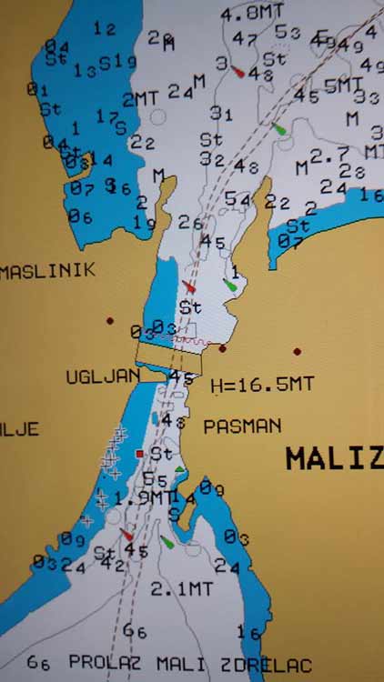 Hoy a la mañana estábamos fondeadas en una bahía paradisíaca.. U Soline… agua cristalina… fría… al SW de la isla Pasman… en el archipiélago de las Incoronatas… después de desayunar decidimos conocer el puente que une esta isla con la del N Uglman… segú el derrotero tiene 16,5 metros de altura… el palo del shipping tiene 14 metros más lo que mide desde la línea de flotación hasta la carroza… pasaríamos raspando… o no… teniendo en cuenta la antena del vhf…. así que navegamos a motor una hora y media hasta el dichoso puente…