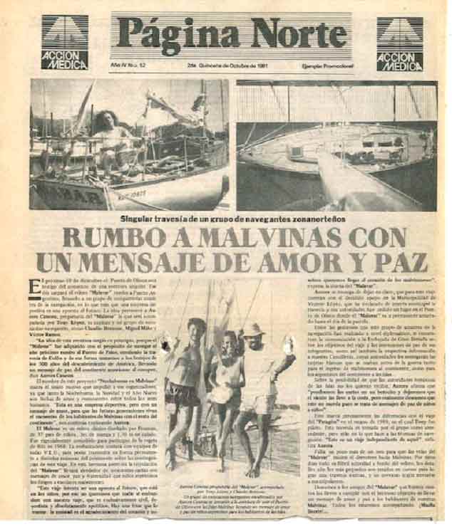 Historia, Malvinas 1992 Página Norte Publicado el 25 octubre, 199125 septiembre, 2019 por grapics Página Norte, Buenos Aires | Aurora Canessa rumbo a Malvinas Recortes de prensa de la travesía del Malabar en 1992