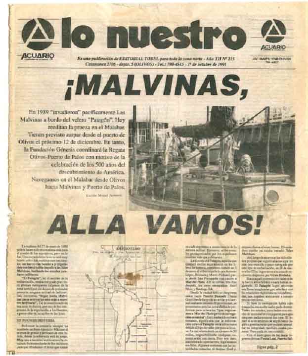 Historia, Malvinas 1992 Lo nuestro Publicado el 1 octubre, 199125 septiembre, 2019 por grapics Olivos, Buenos Aires | Aurora Canessa rumbo a Malvinas Recortes de prensa de la travesía del Malabar en 1992
