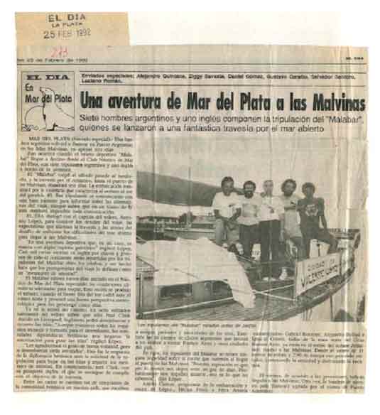Historia, Malvinas 1992 El Día Publicado el 25 febrero, 199125 septiembre, 2019 por grapics La Plata | Aurora Canessa rumbo a Malvinas Recortes de prensa de la travesía del Malabar en 1992