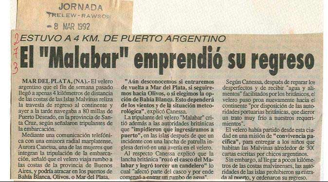 Historia, Malvinas 1992 Jornada Publicado el 8 marzo, 199225 septiembre, 2019 por grapics Jornada, Trelew | Aurora Canessa rumbo a Malvinas Recortes de prensa de la travesía del Malabar en 1992