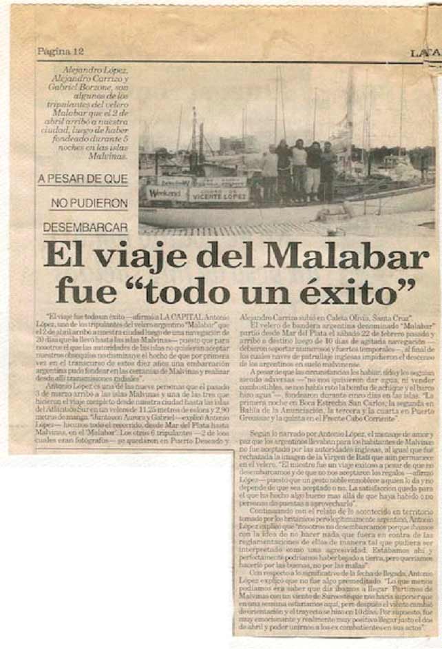Historia, Malvinas 1992 Página 12 Publicado el 9 abril, 199225 septiembre, 2019 por grapics Buenos Aires | Aurora Canessa rumbo a Malvinas Recortes de prensa de la travesía del Malabar en 1992