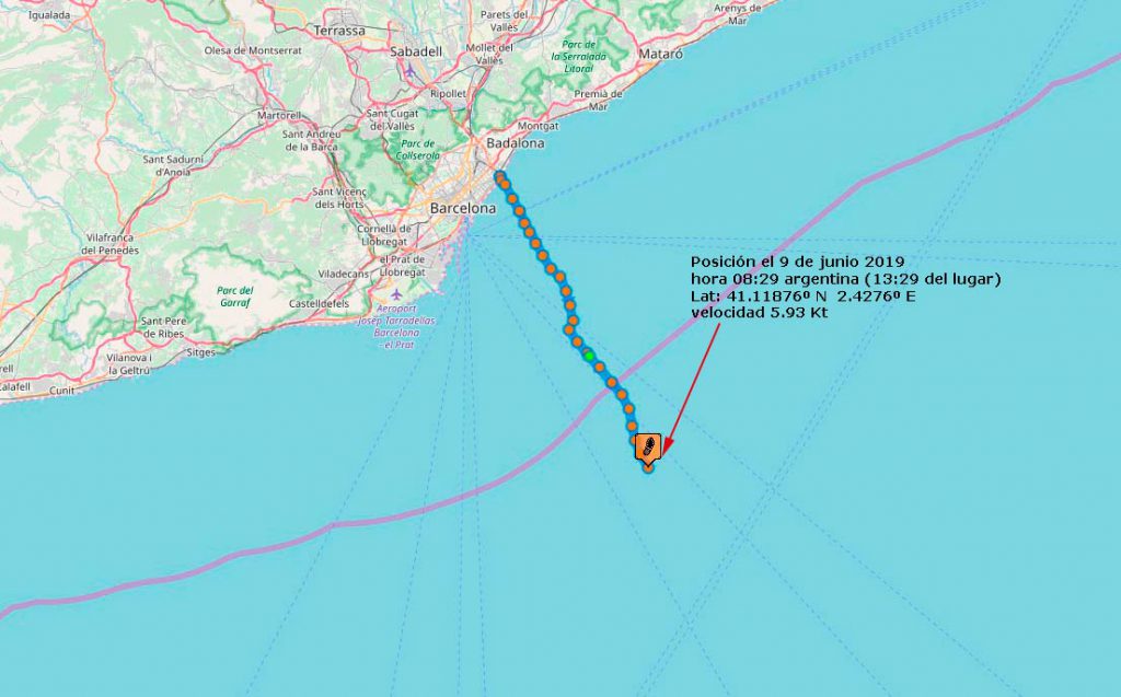 Hola Robert, buen día. Finalmente sono partita, no muy temprano porque no tenía sentido, el mar está movido, tengo 9 nudos de viento, poco viento como lo habías dicho tu, ahora del este, estoy a motor con la vela mayor nada más; aprovecho ahora porque después me quedo sin señal, todo bien, encendí el spot y le puse los piecitos así me podés seguir. Besos