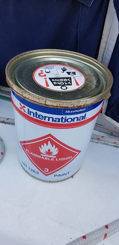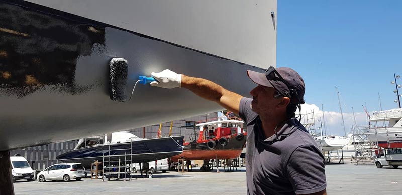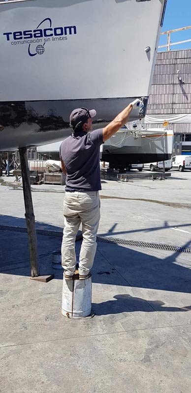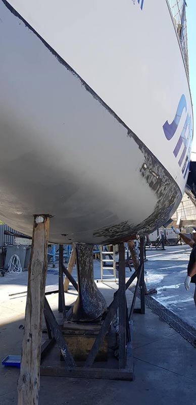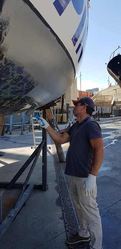 Después de lijar diez años de antifouling Le estamos dando dos manos de underwater primer (pintura puente….) para finalmente darle dos manos de antifouling….