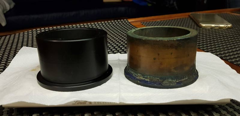 Este es el buje nuevo de la mecha del timón… el material es deldrin….. ( polyoxymethylene)… tiene un coeficiente de fricción muy bajo.. etc.. etc.