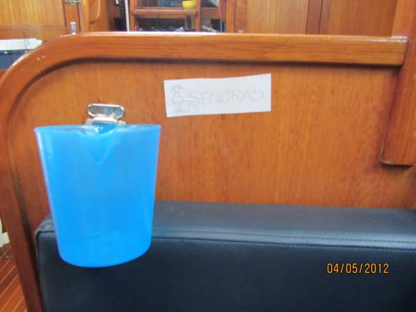 Omar me pidió que controle el pipi por si aparece algún poquito de sangre, lo cual quiere decir que me lesione algo interno… para ello el Capi… que es muy gentil, me organizó con mucho humor, un jarrito de plástico, enganchado en un punto fijo… con un cartelito que dice… señoras…. muy buen humor… además estoy cerca de la pileta de la cocina, así que cuando necesito… le pido que vaya a mirar el mar y yo hago el control del material…. que hasta hoy sale impecable…. gracias a Dios…