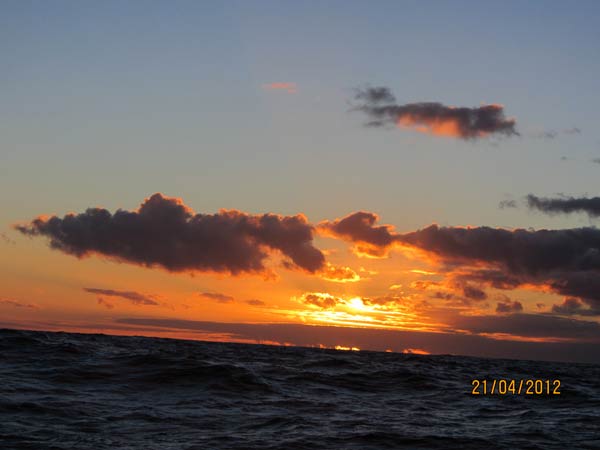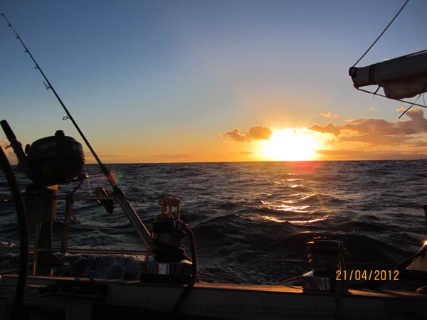 El viernes al mediodía partimos hacia Fiyi, a las dos de la tarde salíamos de la bahia de Russell…al Océano Pacifico, rumbo norte… todo super bien… por fin..!!! el barco navega como los dioses, empezamos la guardia a las 14 hs…. el primer día para aclimatarme, de dos horas…. luego serian de 4 hs…. a las 16 hs tomé la mía sin novedades…. con un viento de 20 nudos del E/NE… todo bien… a las 18 hs toma la guardia Stuart hasta las 20 hs…. a la caída del sol la cerveza de Sunset que me entere que es la caída del sol en inglés y no la confitería bailable de Olivos…. así que inmediatamente me fui a dormir… .en eso estaba cuando una explosión infernal me despierta…. no entendía que estaba sucediendo… Stuart que mira adentro y me pregunta en inglés si pasaba algo adentro yo que salgo inmediatamente al cockpit a ver que pasaba y nunca me imaginé una situación de emergencia, con alguien que me daba órdenes en un idioma que no domino…. una cosa es cuando estamos tranquilos hablando y con santa paciencia me explica las palabras… y otra es en medio de un caos pedirme que haga cosas absolutamente necesarias para que no se caiga el palo…. resultó que se partió un herraje que une la landa con el obenque de estribor.. justo de donde recibíamos 20 nudos de viento…. y con olas de tres metros más o menos…(hacía una semana que soplaba fuerte de ese sector..) la noche negra.. sin luna ..no se veía nada.. pero la experiencia y la fuerza del capitán fueron decisivas en este momento… por supuesto se enredó todo en la escota boba de la trinquetilla y no podíamos virar el barco hasta no desenredar todo.