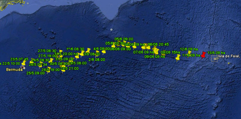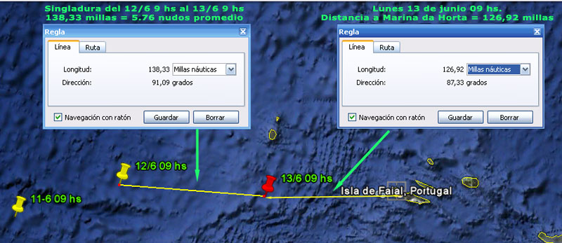 | Son las 09:00 horas del lunes 13 de junio – Mi posición 38º 28′ N – 31º 18.900′ W – Voy en rumbo directo a Azores 90 º – Velocidad 6 / 7 nudos – Distancia a Faial – Marina da Horta 126 millas.
