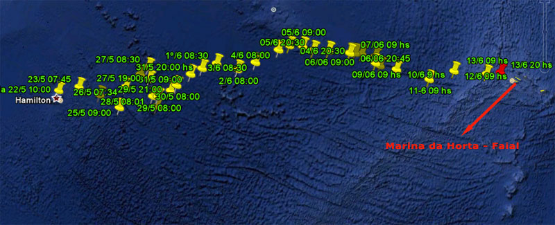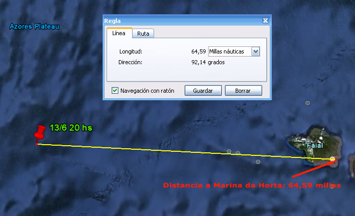 Mi ETA según el GPS es mañana martes 14 a las 10:40 hora Argentina, o sea 12:40 hs de Azores. Se que me está esperando Enrique Celesia para tomarme el cabo de amarre, qué alegría me da.