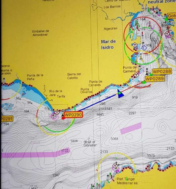 Me llamo, muy feliz y me comentó de su «ángel de la guarda», para el cruce del estrecho: El amigo Dani Uriarte, que está en la Torre de control de Algeciras. Su información fue muy valiosa para hacer el cruce del estrecho, siempre complicado con el tráfico de mercantes. Así que Auro muy agradecida con Dani.