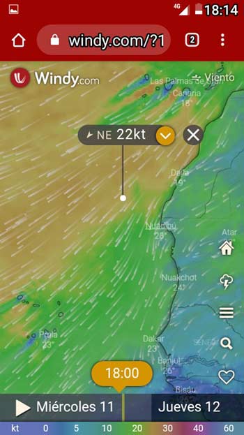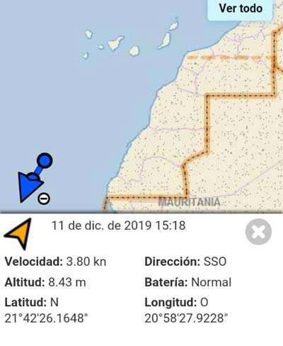 Adjunto imágenes de la posición, las condiciones de viento, y otra que deja en claro que en navegaciones oceánicas ya no se puede salir sin AIS.