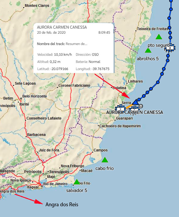 El Shippng, Aurora Canessa y tripulación rumbo a Angra dos Reis. Posición para el 20 de febrero a las 08:09 hora de argentina y situación respecto a Angra dos Reis.
