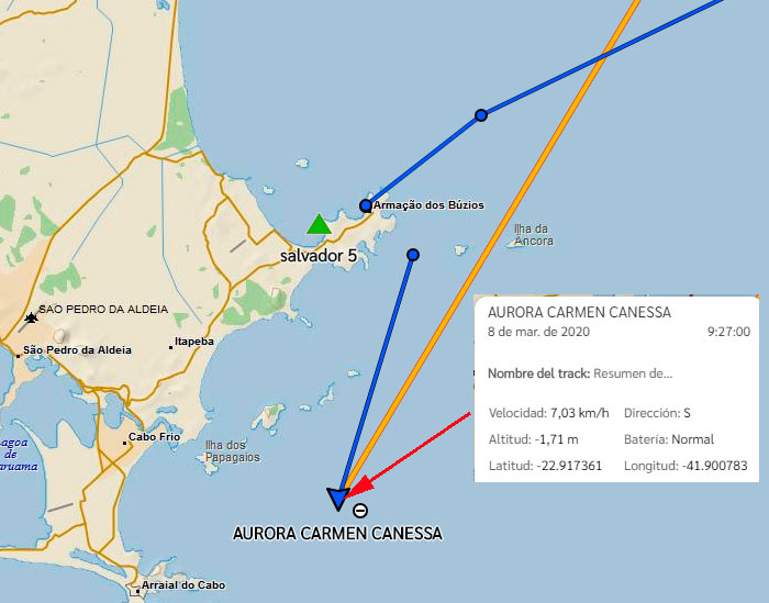 El Shipping, Aurora Canessa y Omar Sanchez en navegación rumbo a Angra. Posición para las 09:27 del 8 de marzo 2020. Aproximadamente tres días de navegación.