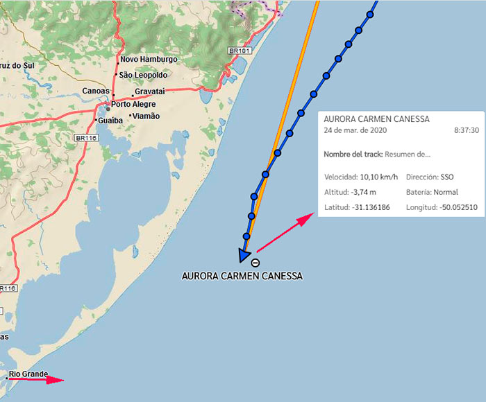 24 Mar Año 2019 - Retornando a casa, El Shipping Hoy - Relatos de Aurora El Shipping en navegación a Río Grande – Posición para el 24 de marzo 08:37 Publicado el 24 marzo, 202024 marzo, 2020 por Roberto Garro El Shipping, Aurora Canessa y Omar Sanchez en navegación a Río Grande. Posición para el 24 de marzo a las 08:37 y situación respecto al puerto de arribo.